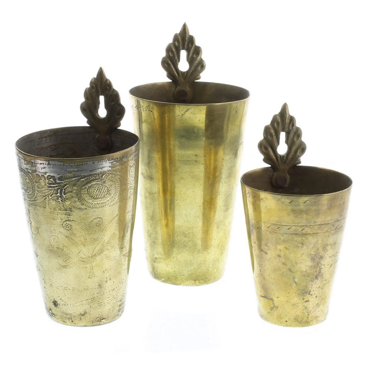 Featuring beautifully worn patina, our brass Lassi Cups – originally used for serving a traditional yoghurt-based drink called lassi – are given a lift with an added hanging element. Each piece is unique and all will vary. SOLD INDIVIDUALLY.