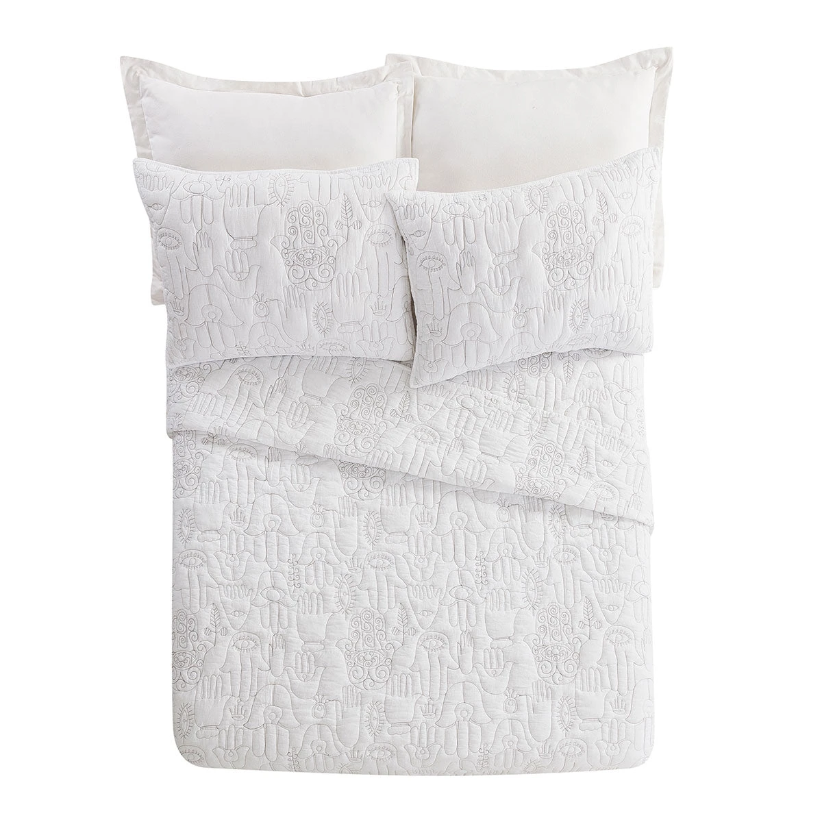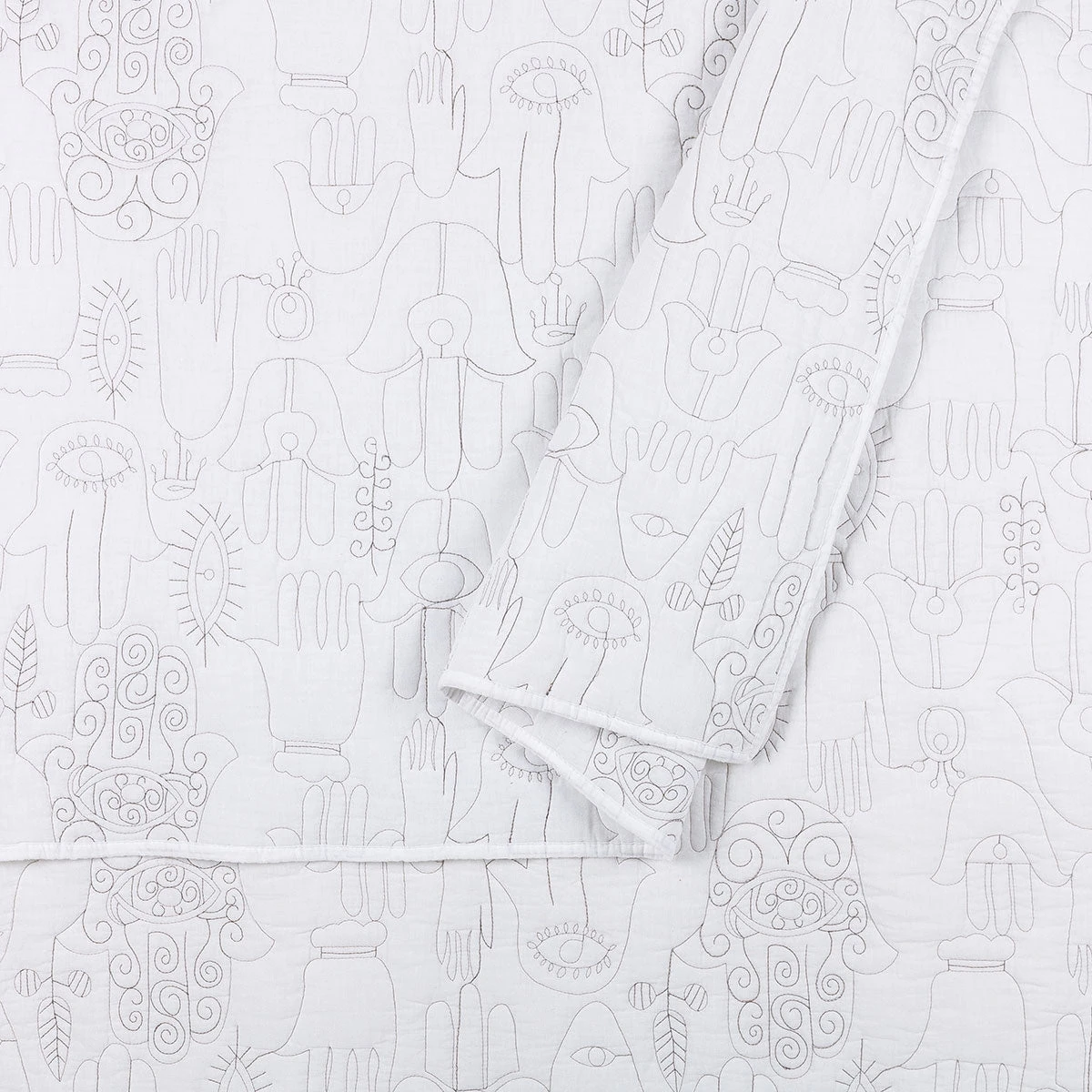 This mega-cozy quilt set is adorned with embroidered, hand-drawn illustrations of hamsas from Justina’s own hamsa amulet collection from her global escapades. The hamsa, also known as the Hand of God or the Hand of Fatima, is an ancient amulet symbolizing protection, happiness, luck, health and good fortune. What better way to establish good vibes in your abode than to wake up in that sorta goodness on the reg?